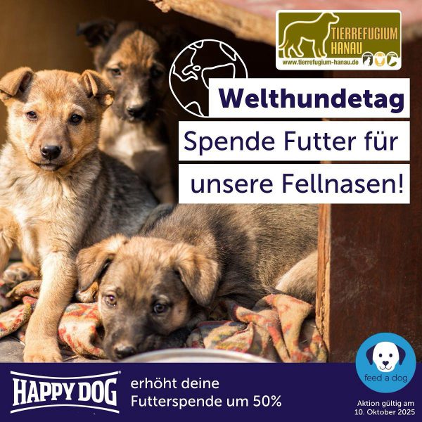 Das bedeutet für euch: Für jede Futterspende, die ihr an diesem Tag über die feed a dog App für das Tierrefugium Hanau e.av. macht, legt Happy Dog 50 % Extra-Futter oben drauf!